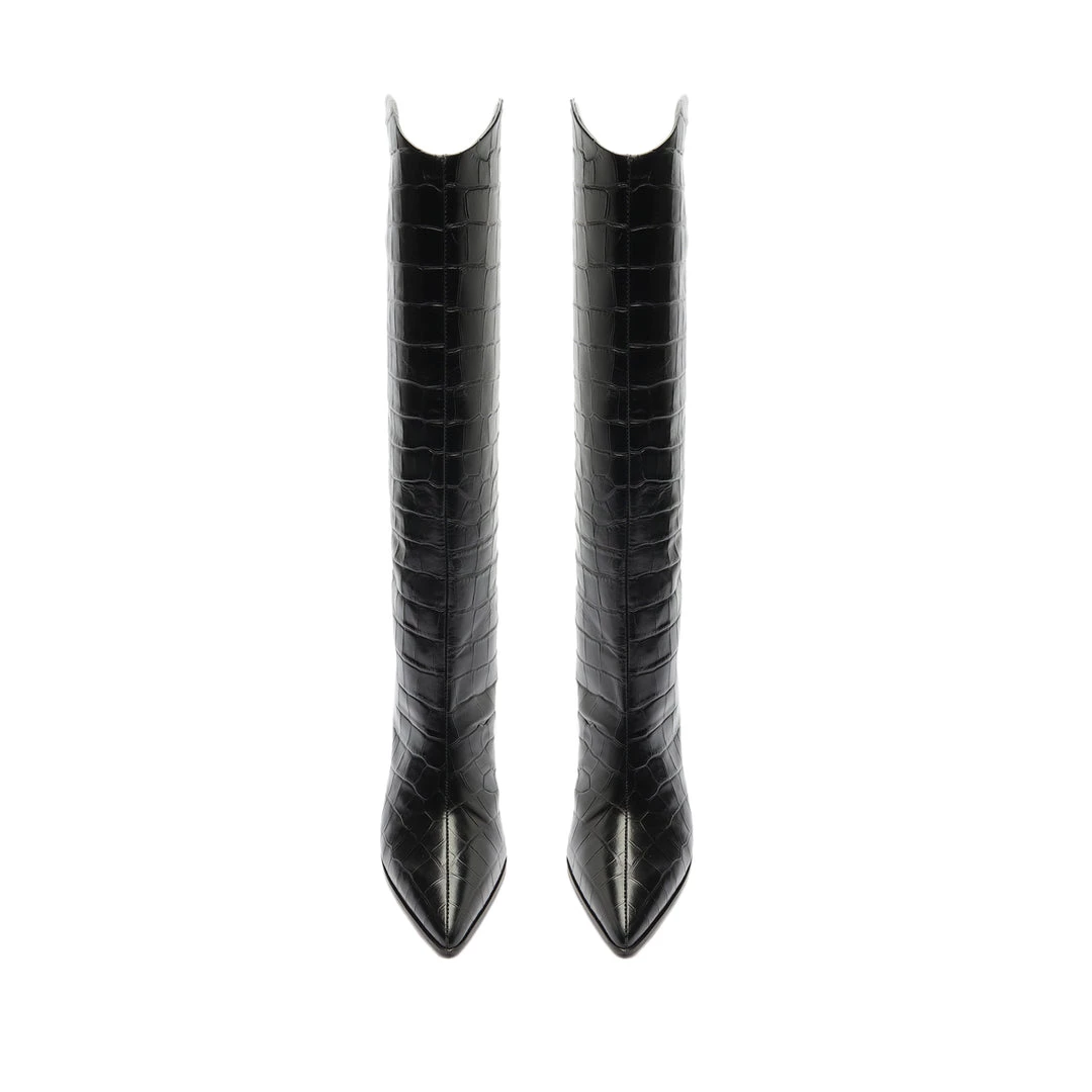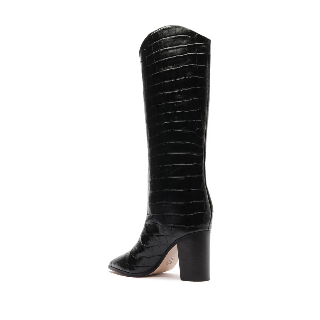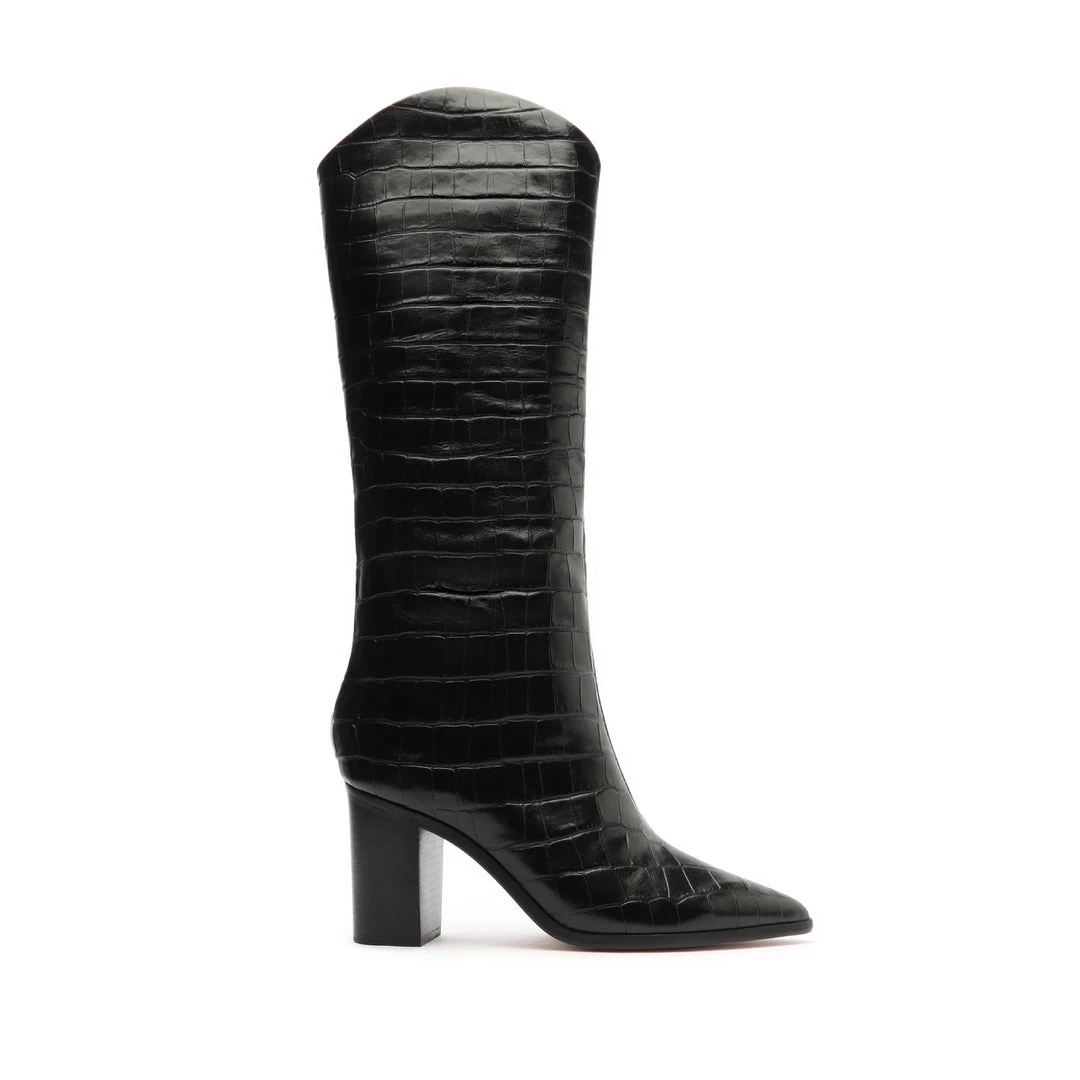 The Analeah Boot is a knee-high silhouette crafted from Wide Crocodile-Embossed Leather with a chunky stacked heel. This versatile slip-on style features a flattering almond-shaped toe and complements daytime and evening outfits with a chic sensibility. The Schutz woman will wear hers with a flowy midi dress or a pleated skirt.