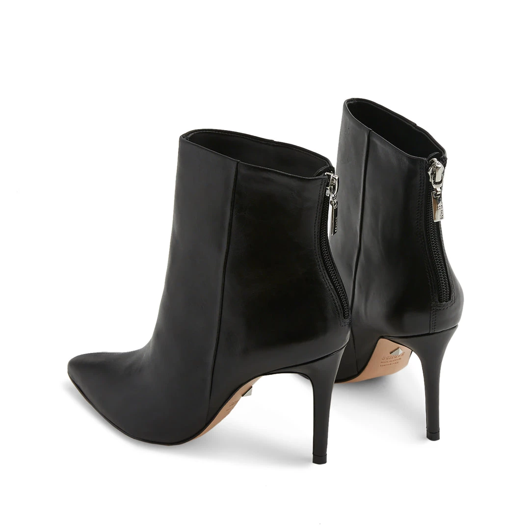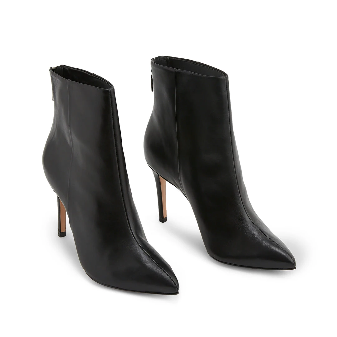 Every step in this high-heeled bootie makes a wild statement. Designed in black leather, this wear-everywhere silhouette features a pointed toe and stiletto heel.