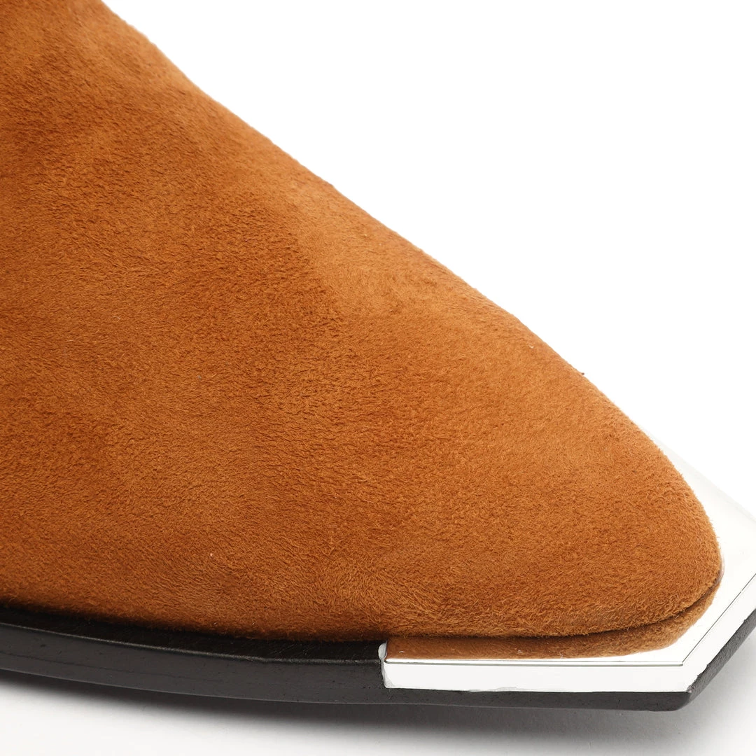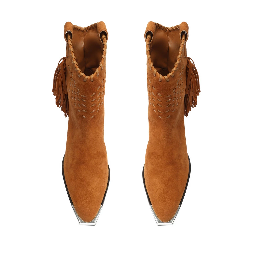 Western inspiration defines the Alexxa Bootie, a pointed-toe shape crafted from suede with a metal detail at the toe.