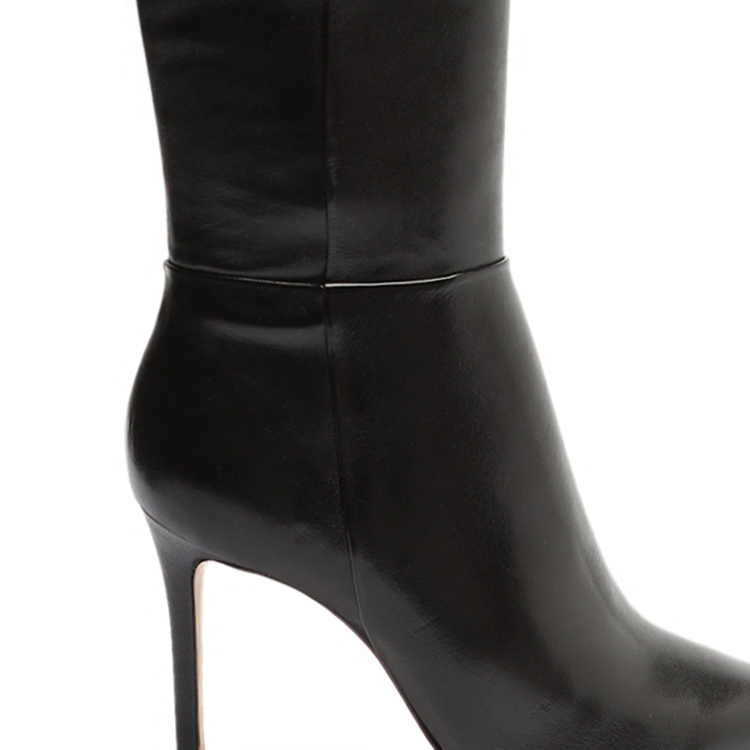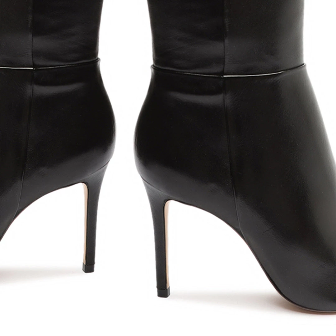 Boot up. This sleek knee-high silhouette is designed in leather with a pointed toe and stiletto heel.