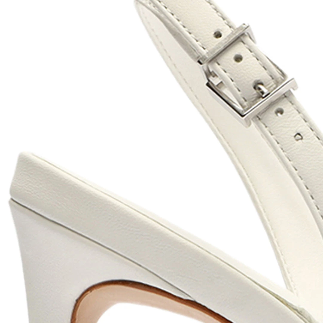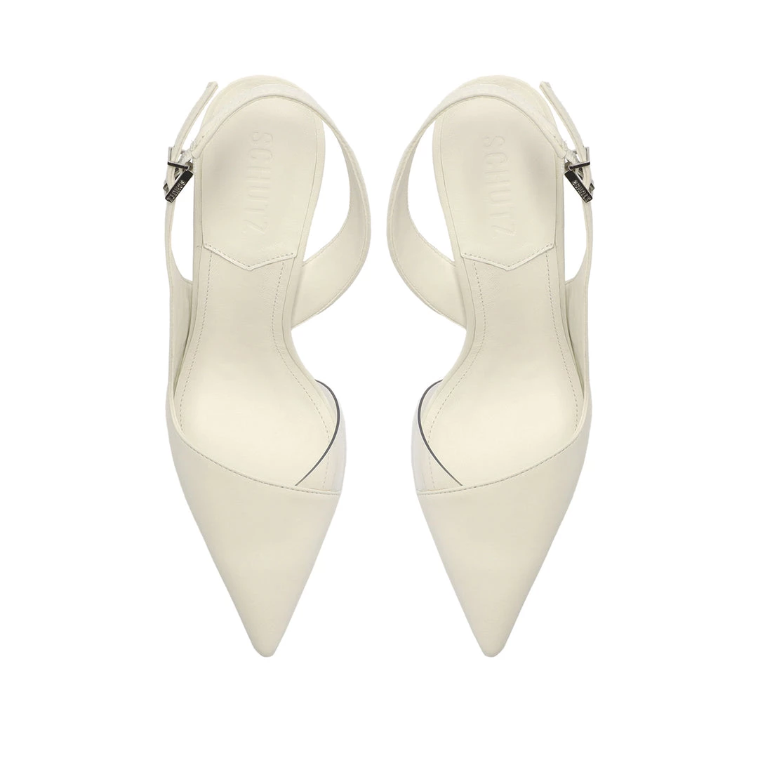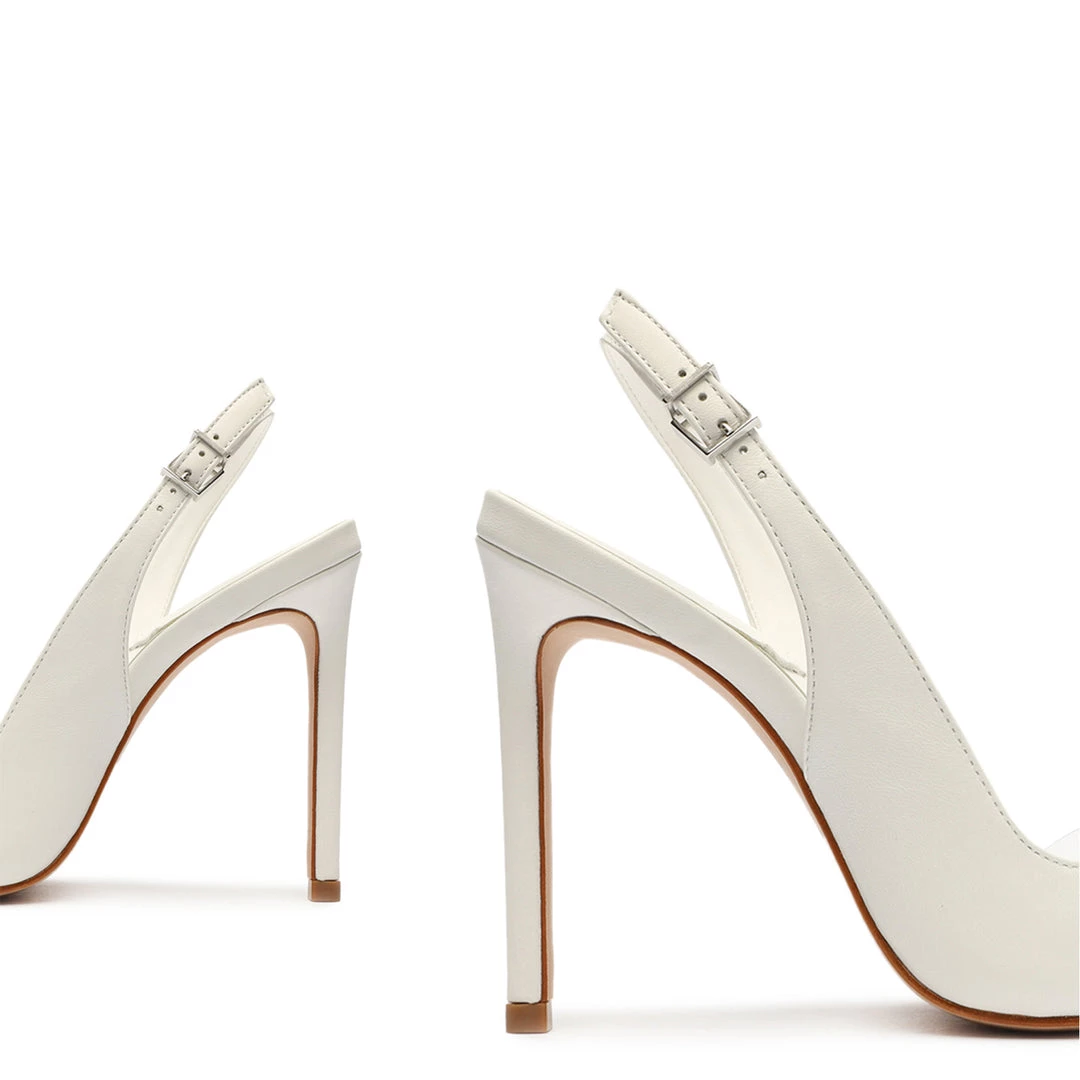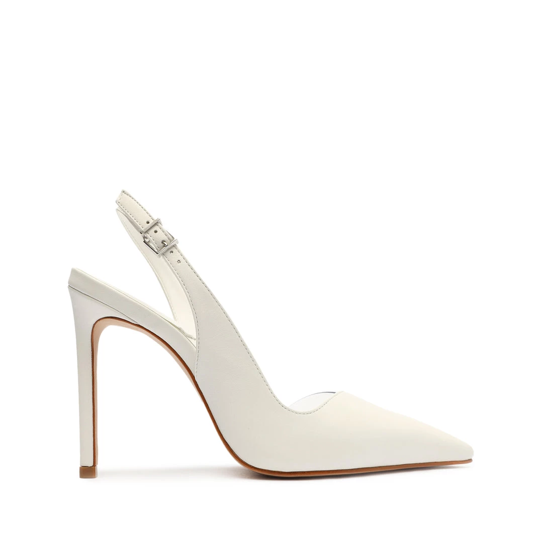 A modern interpretation of the slingback pump, crafted from smooth leather with a pointed toe and stiletto heel.