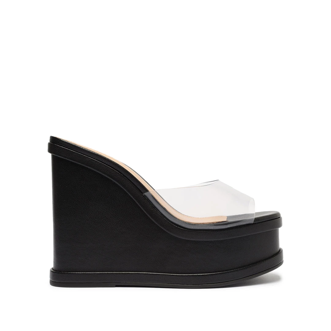 Up the glam factor in the Dalle, a soaring platform sandal featuring vinyl and leather details.