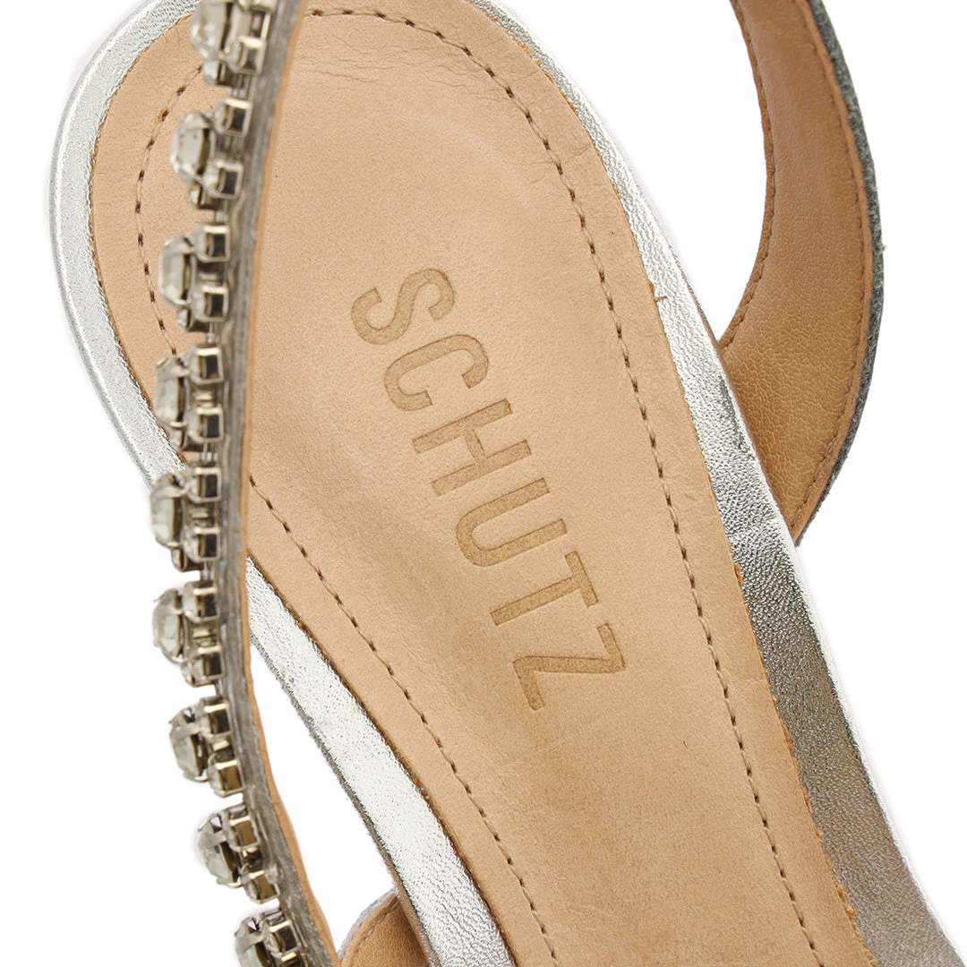 A statement-making sandal crafted from metallic leather with crystal-adorned straps and a stiletto heel.