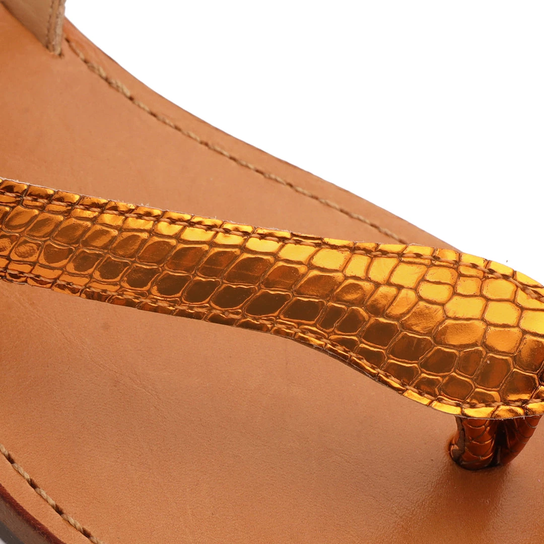 The Courtney Sandal is a flat silhouette crafted from metallic leather with slim, sculptural straps.