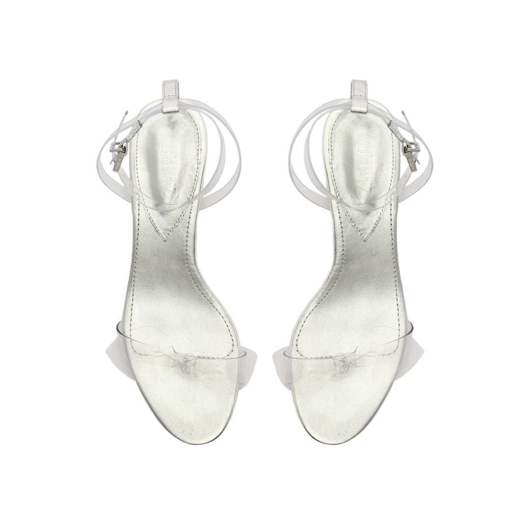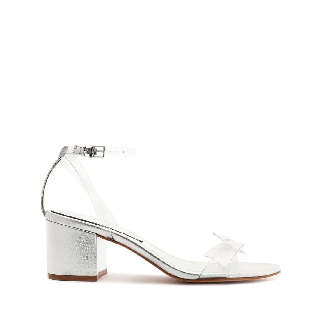 Metallic leather and see-through vinyl accents fuse to chic effect on this block-heeled sandal.