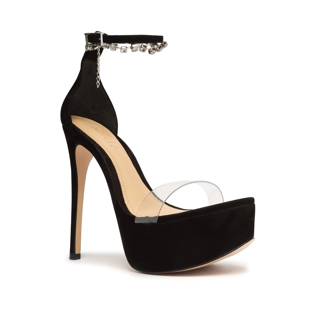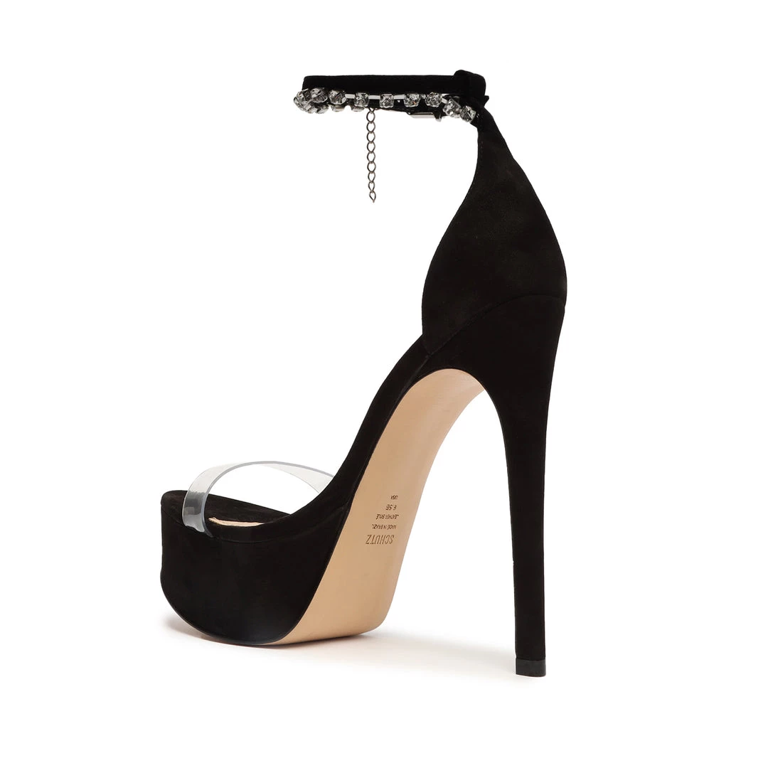 Introducing Lah Sandal: an on-trend Spring Platform crafted in Vinyl and Nubuck, with a removable crystal strap at the ankle. An eye-catching shoe you will love wearing.