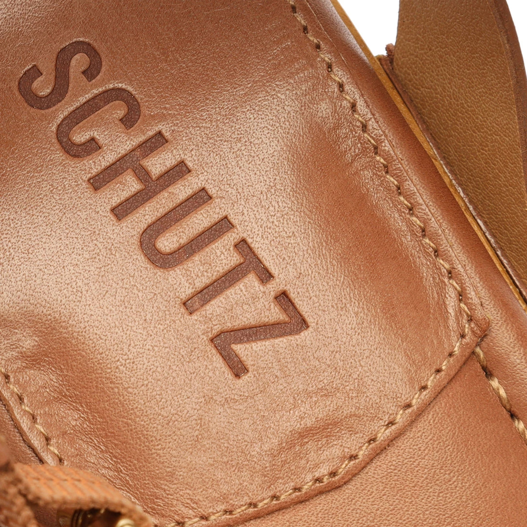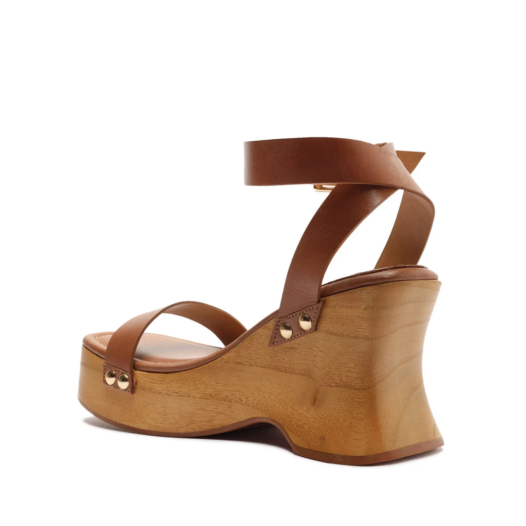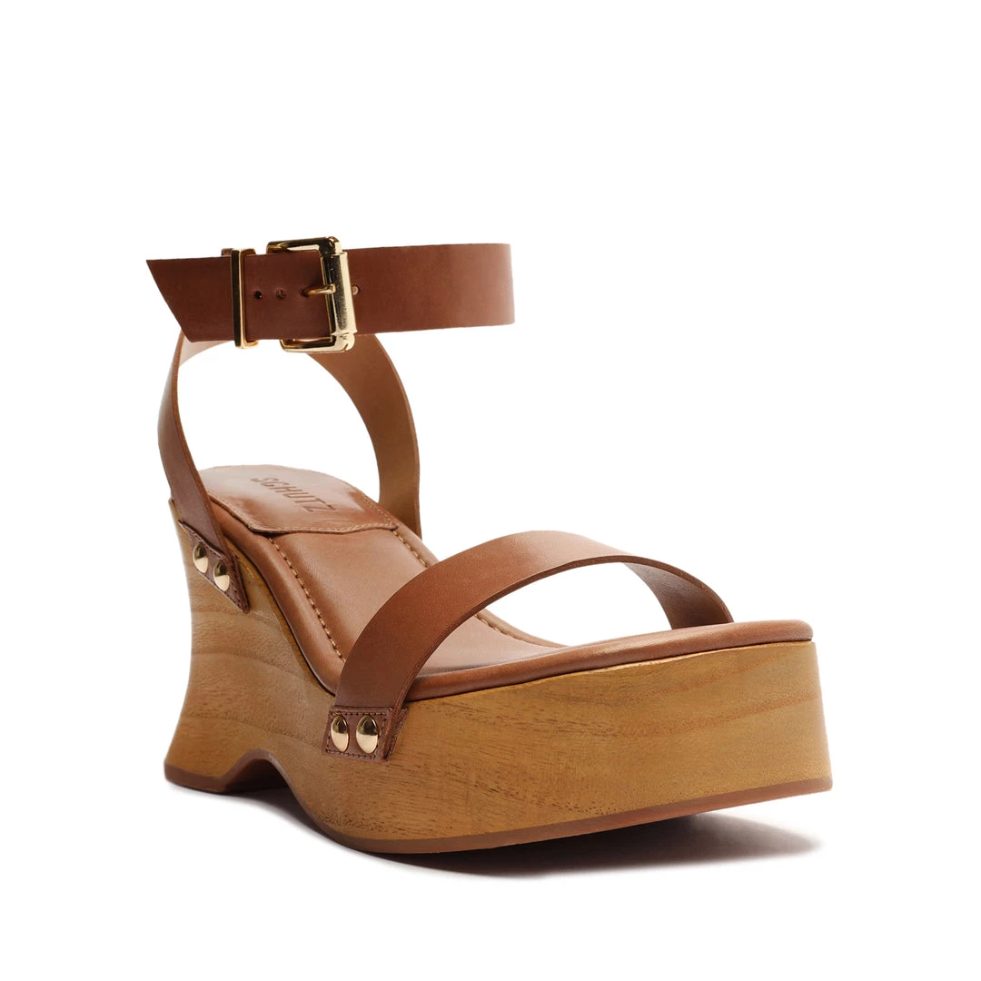Combining elements of a clog and a platform sandal, the Lansy is made from leather and set on a wooden platform. This style is finished with gold-tone hardware.