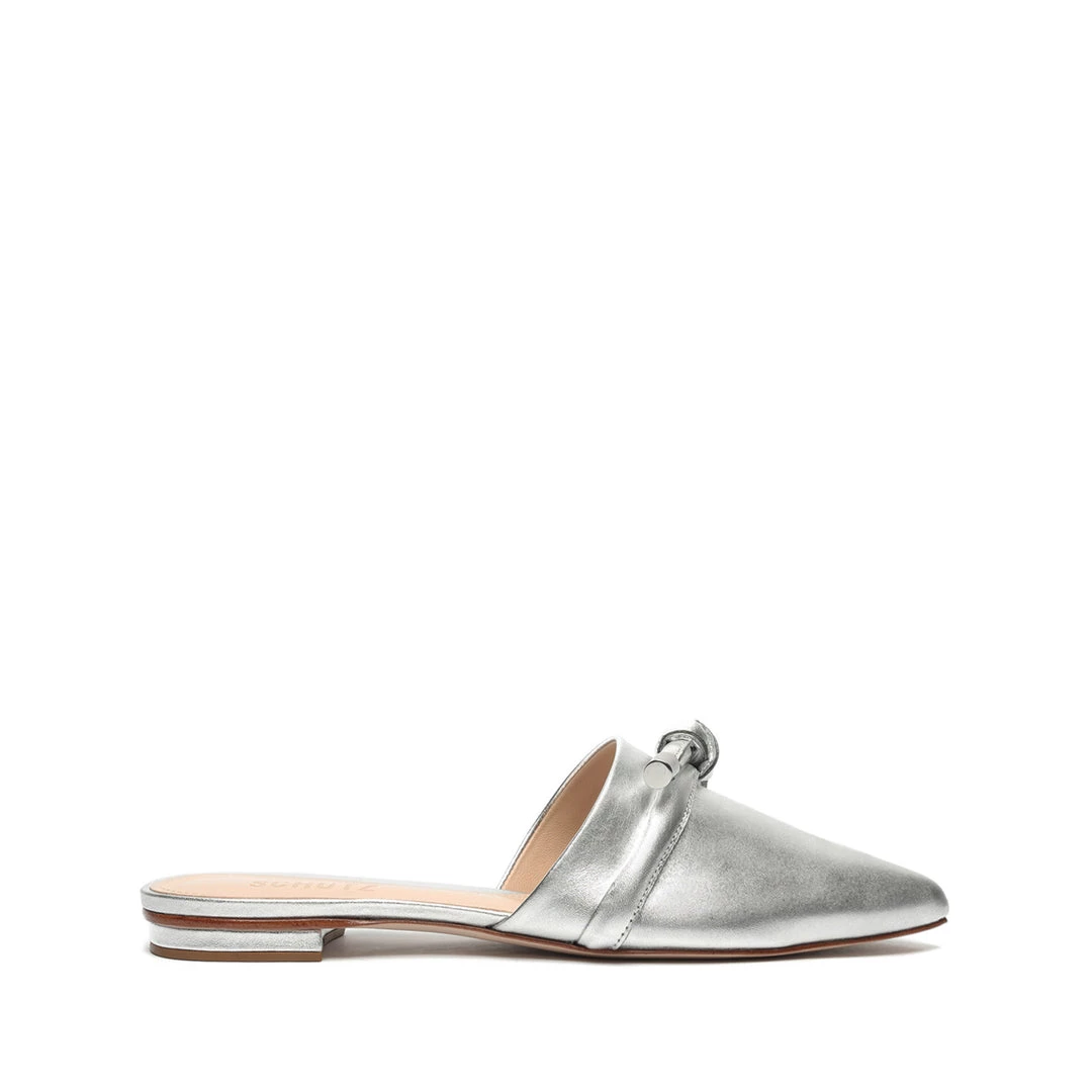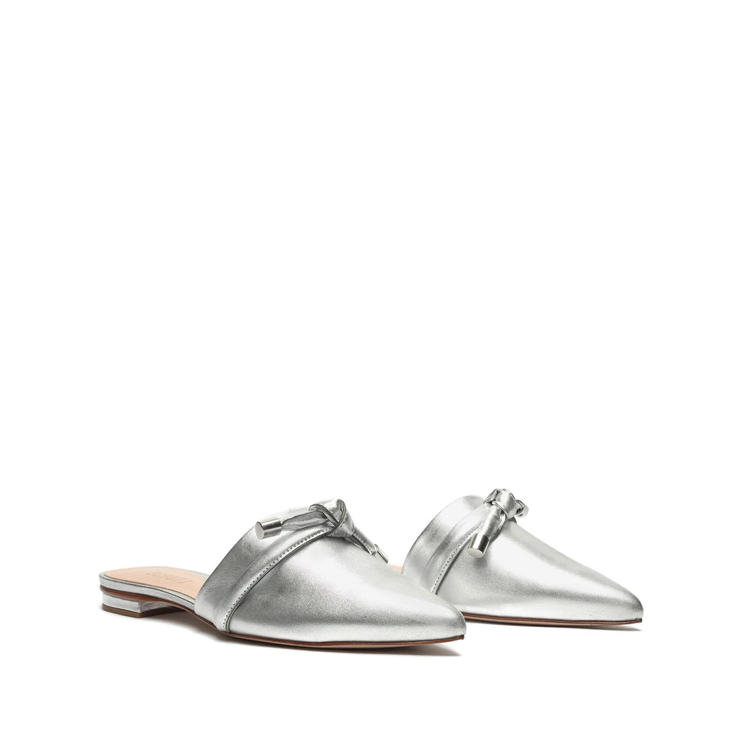 A modern take on the mule, this metallic leather style showcases a pointed toe and knotted accent.