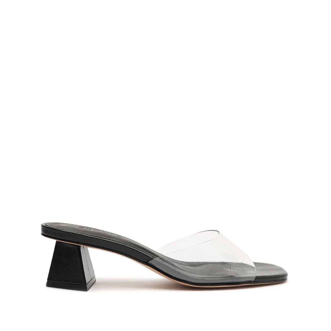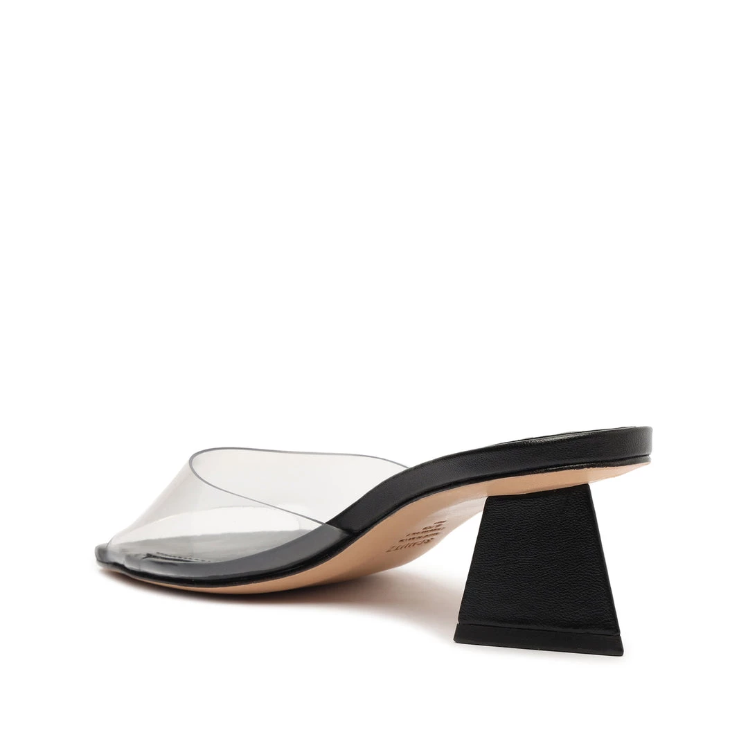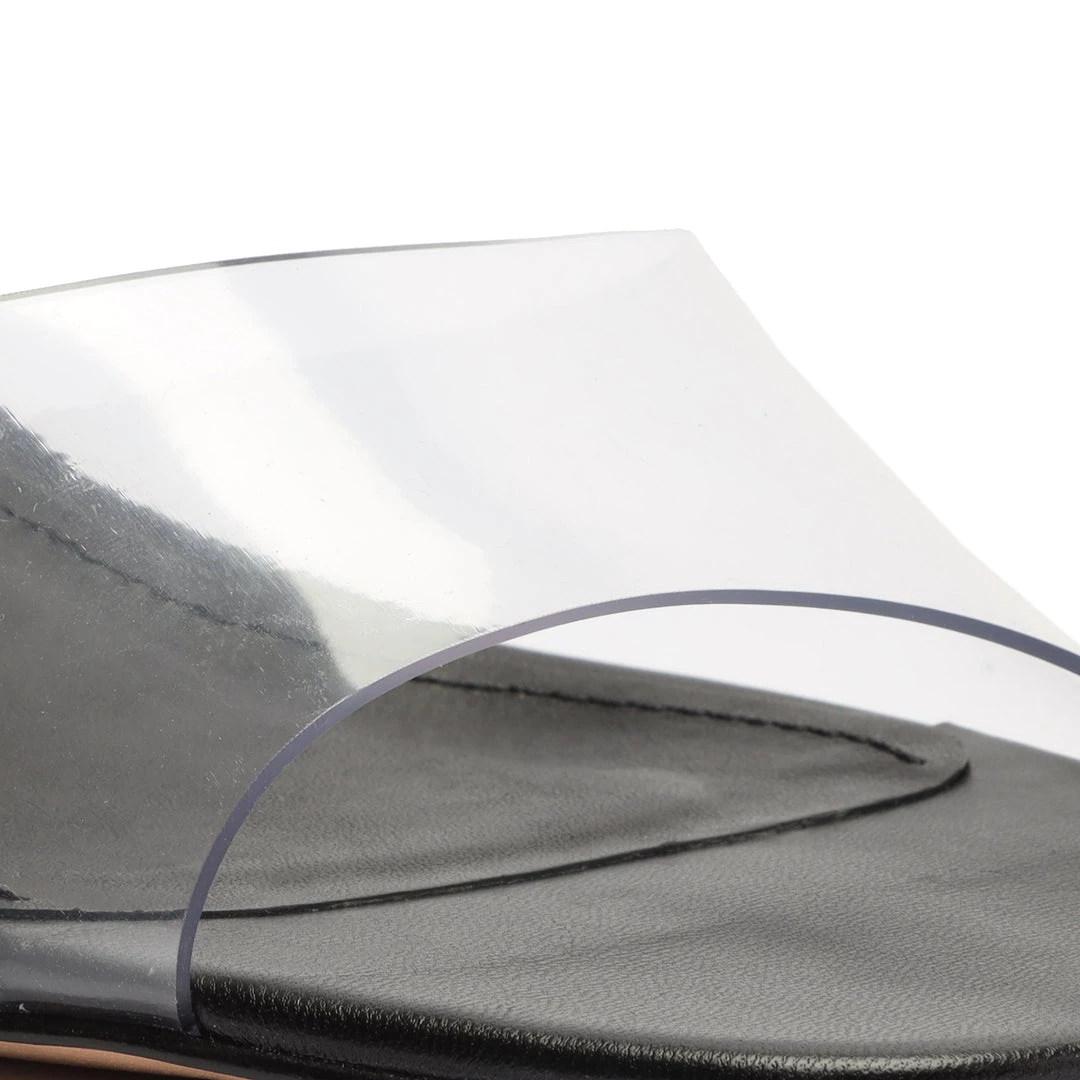 A versatile and minimal mule crafted in leather with a see-through vinyl upper strap.