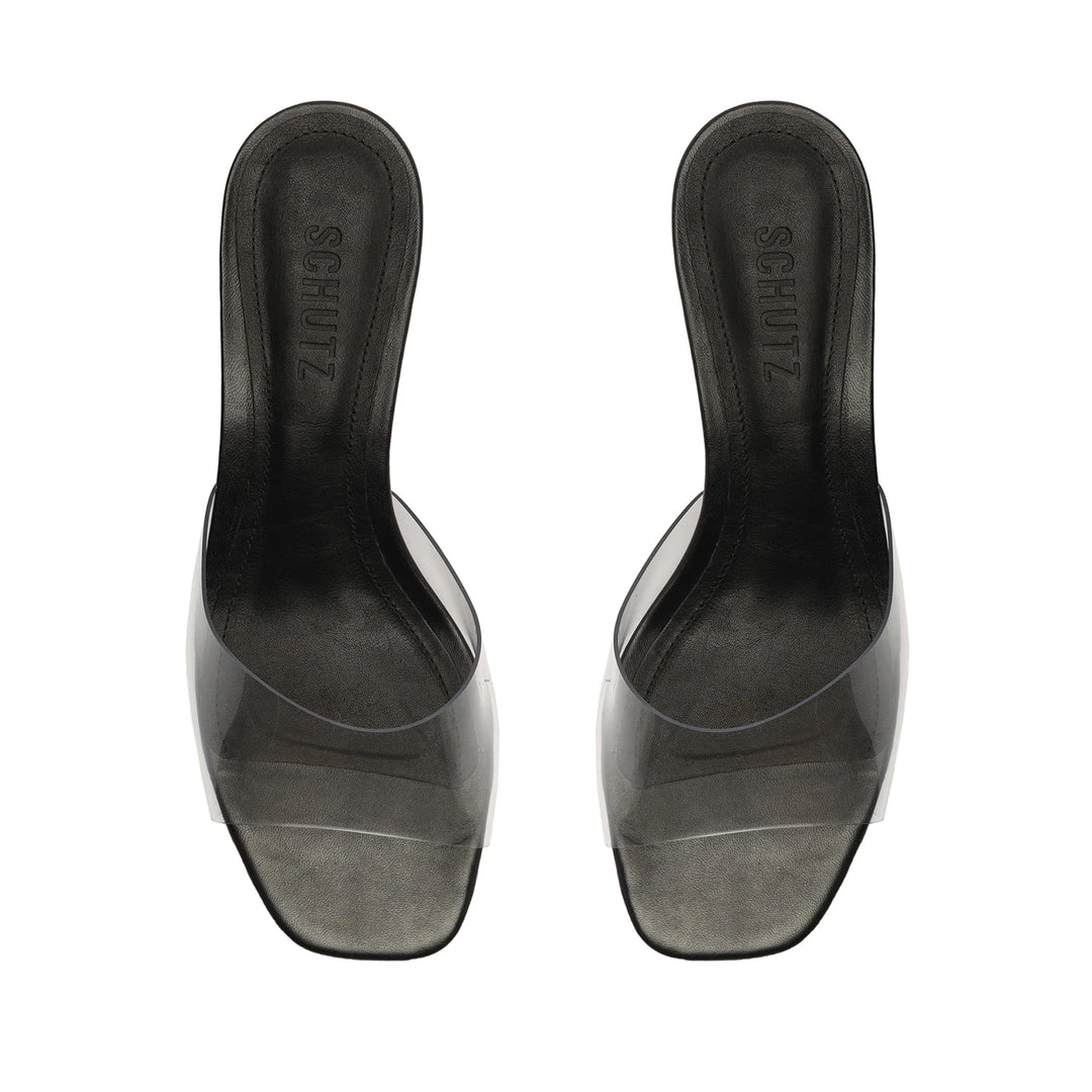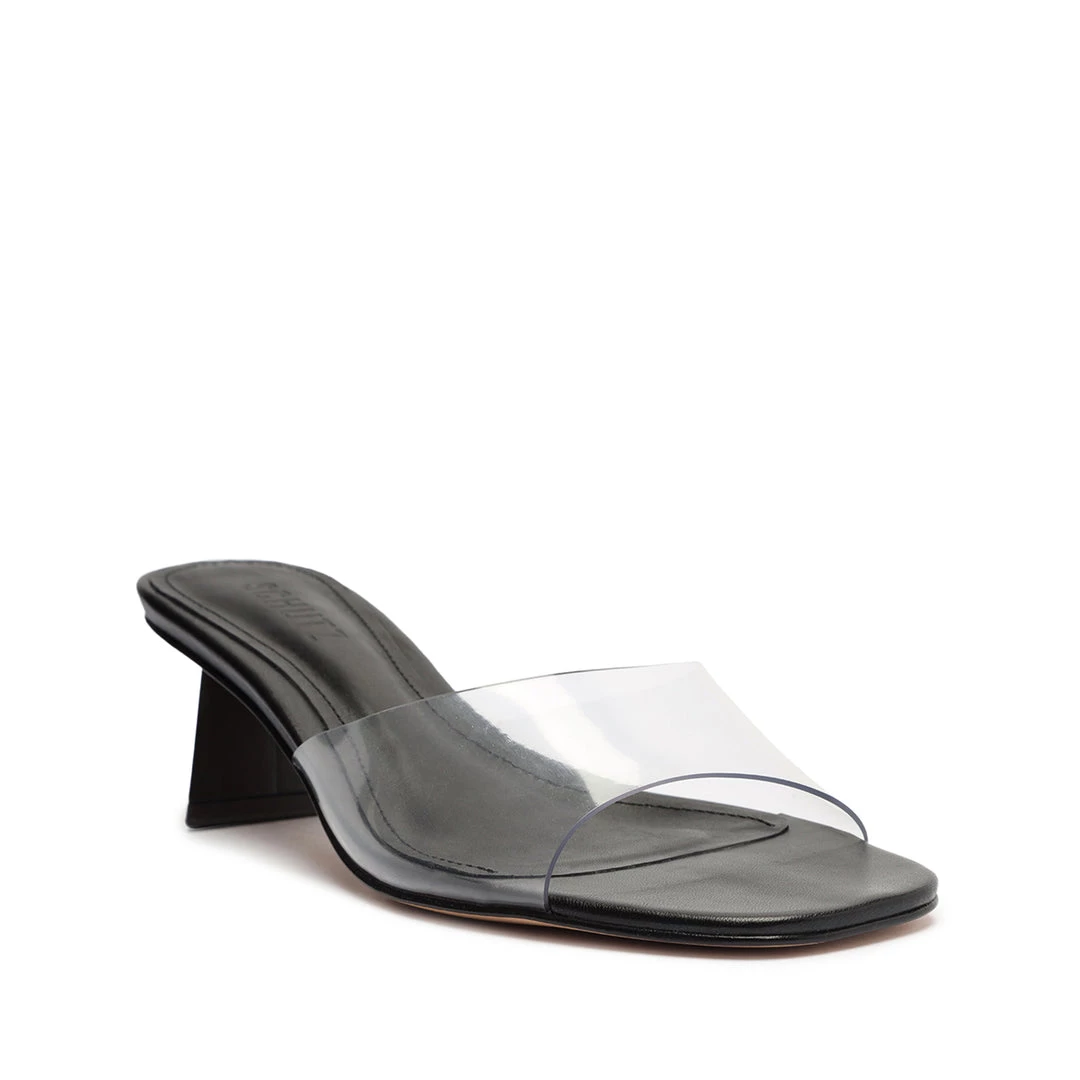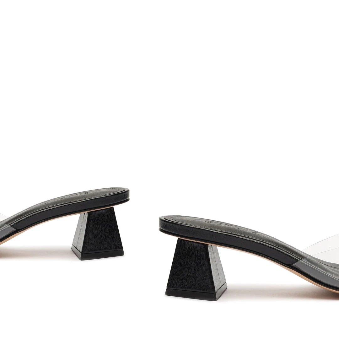 A versatile and minimal mule crafted in leather with a see-through vinyl upper strap.