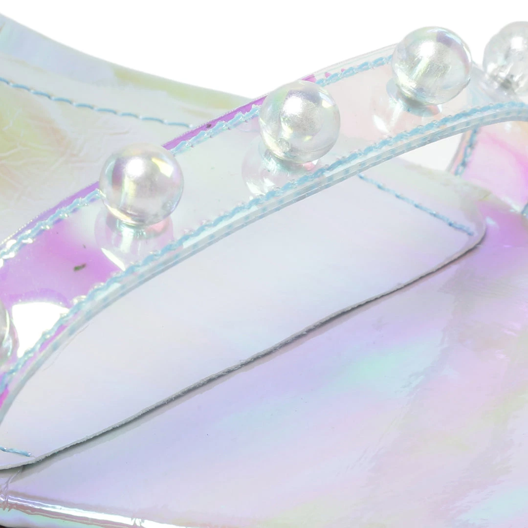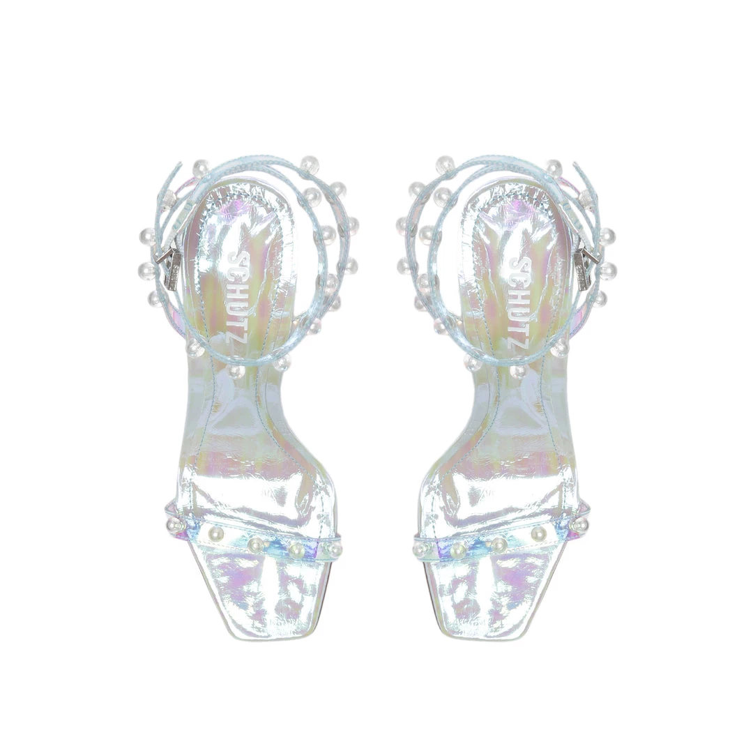 An iridescent finish and studded details lend statement-making flair to the Pietra sandal. This style is finished with a stiletto heel and square-shaped toe.