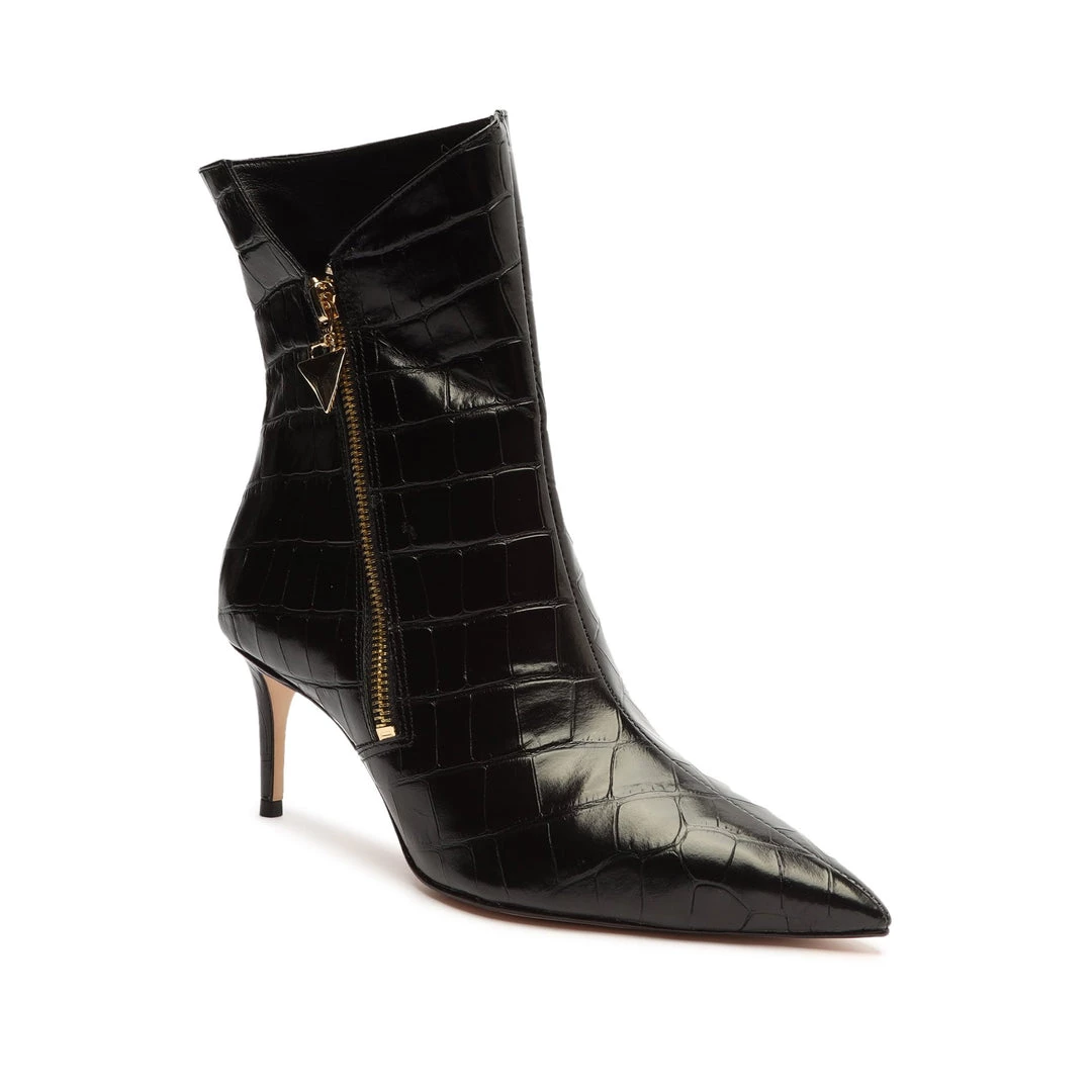 Exotic meets edgy in the Van, a sleek ankle bootie designed in crocodile-embossed leather with a side zip fastening and pointed toe.