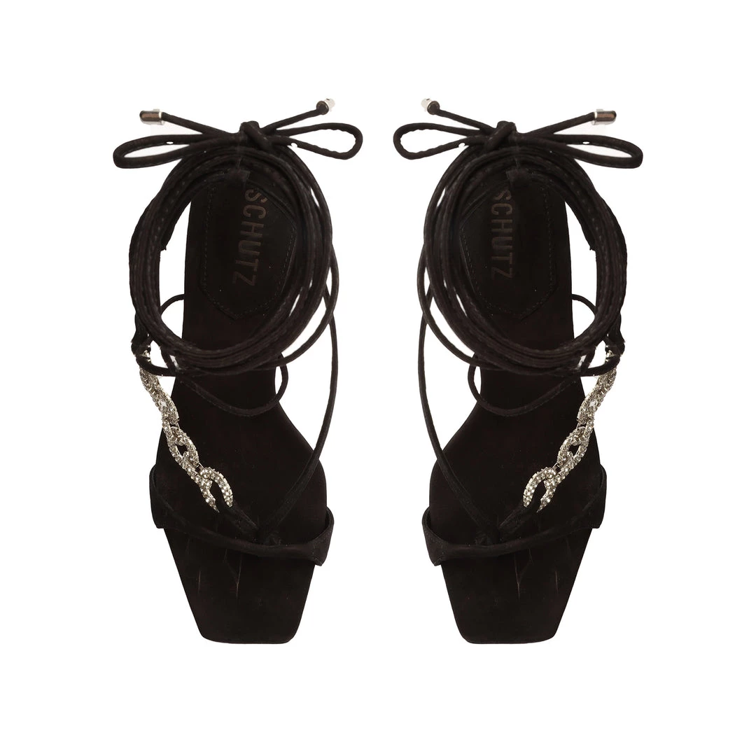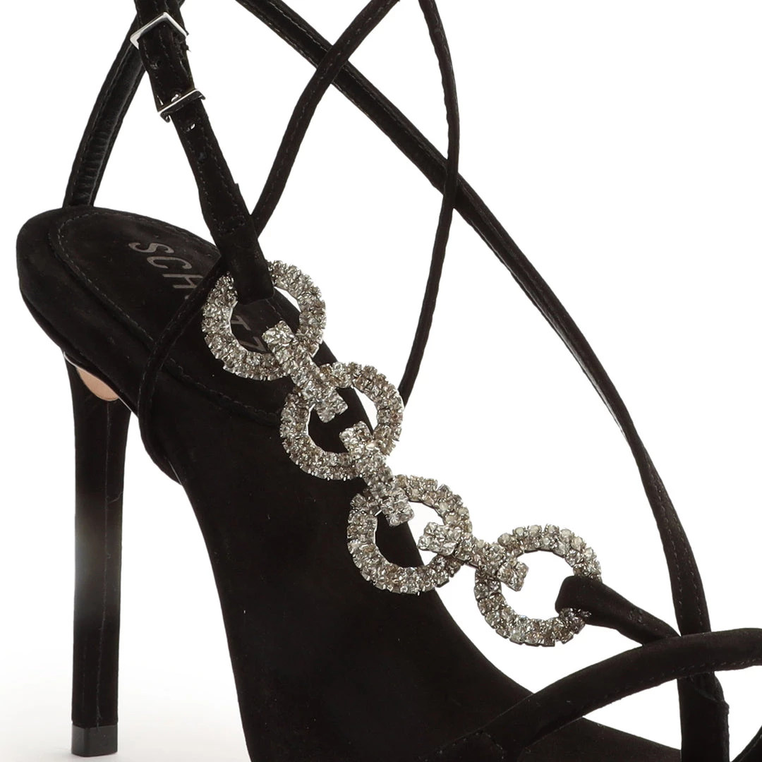 Up, up and away. Reach new style heights in the Vikki Glam Sandal. This stiletto-heeled style is crafted from leather with chain-link accents and ankle-wrap detailing.