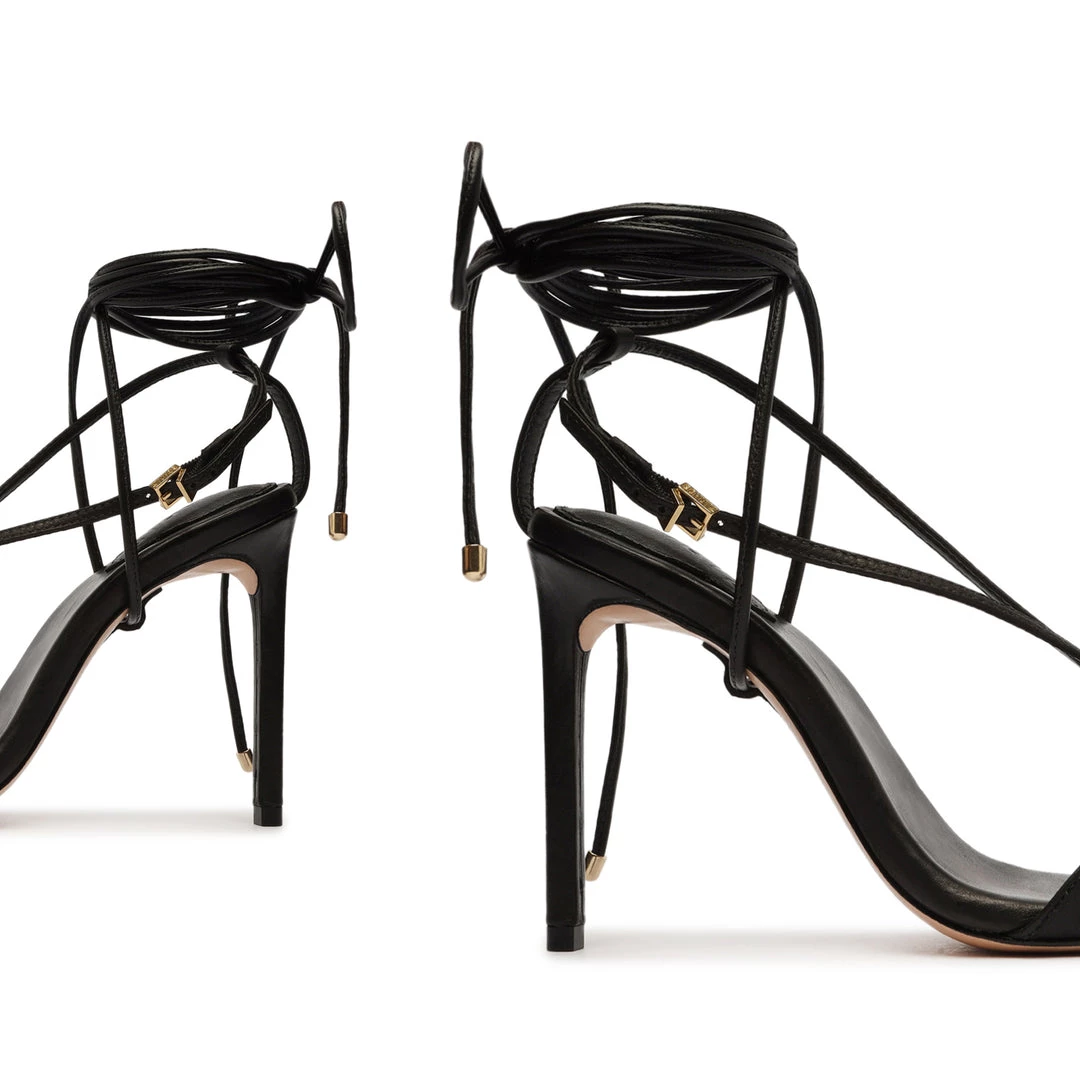 Up, up and away. Reach new style heights in the Vikki Leather Sandal. This stiletto-heeled style is crafted from leather with a square-shaped toe and ankle-wrap detailing.