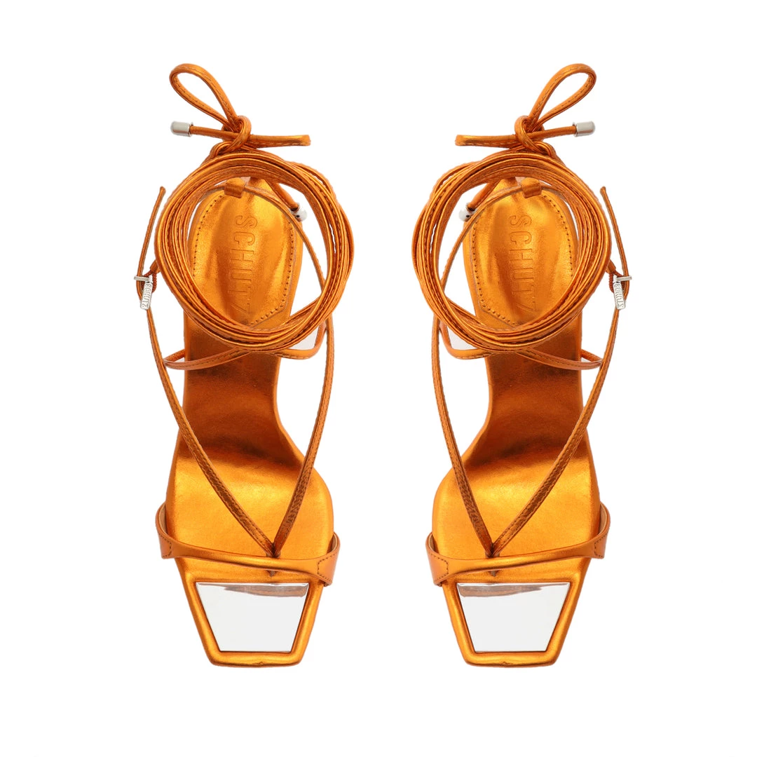 Up, up and away. Reach new style heights in the Vikki Leather Sandal. This stiletto-heeled style is crafted from Metallic Leather with a square-shaped toe and ankle-wrap detailing.